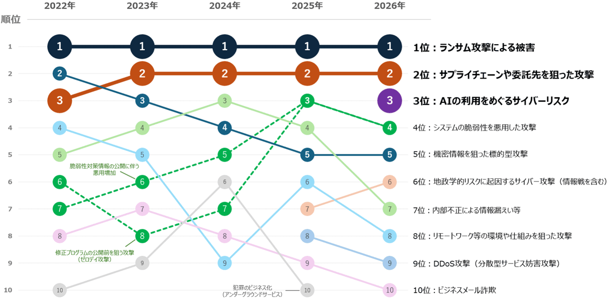 4年連続でランサムウェア攻撃が1位、サプライチェーン攻撃が2位にランクインしています。セキュリティ担当者は対策や警戒を強めていると思われますが、引き続き多くの被害事例が報告されており、あらためて注意が必要です。また、2026年は新たに「AIの利用をめぐるサイバーリスク」が初登場ながら3位にランクインしました。